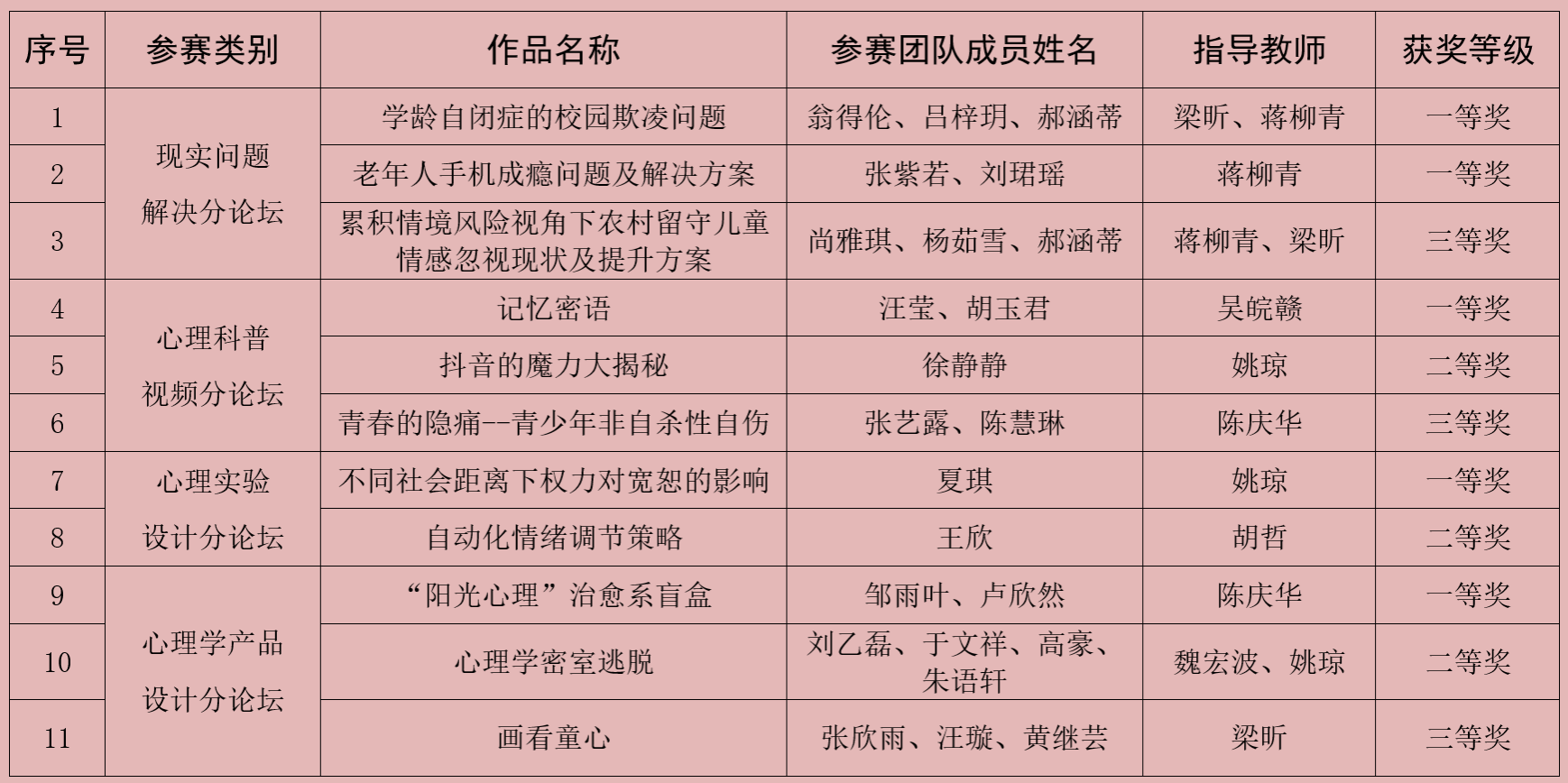 近日,由安徽省高等学校教育学类合作委员会、安徽省心理学会和安徽师范大学教育科学学院共同主办的“安徽省首届心理学专业本科生创新创业论坛”在安徽师范大学落下帷幕。yl23411永利集团应用心理学专业11个本科生团队获得一等奖5个,二等奖3个,三等奖3个,一等奖数量居参赛院校首位,学校荣获优秀组织奖。