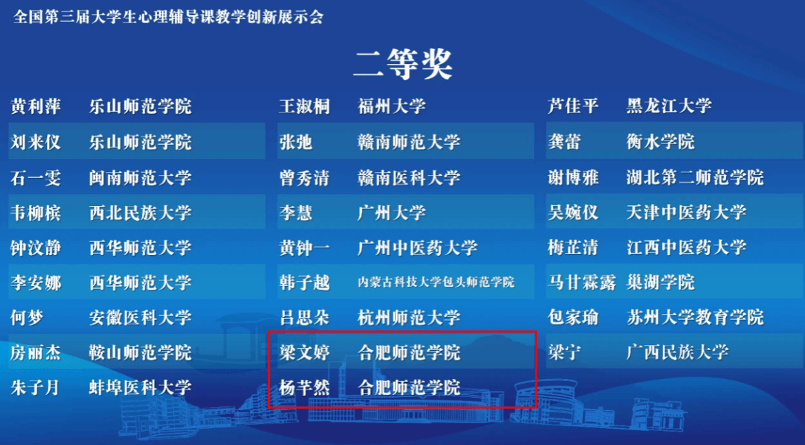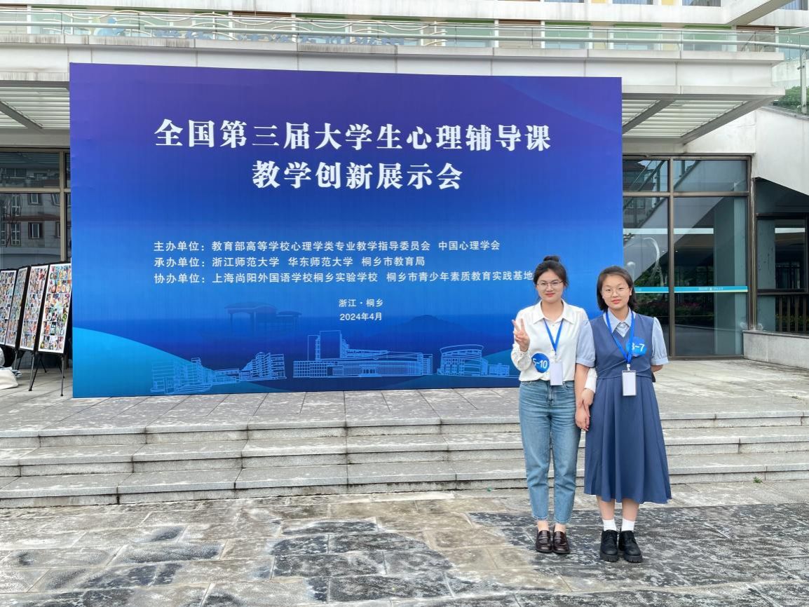 4月25日至26日,由教育部高等学校心理学类专业教学指导委员会、中国心理学会主办,浙江师范大学、华东师范大学、桐乡市教育局承办的全国第三届大学生心理辅导课教学创新展示会在浙江桐乡举行,yl23411永利集团2021级本科生梁文婷、2022级本科生杨芊然凭借出色的表现双双斩获全国二等奖。