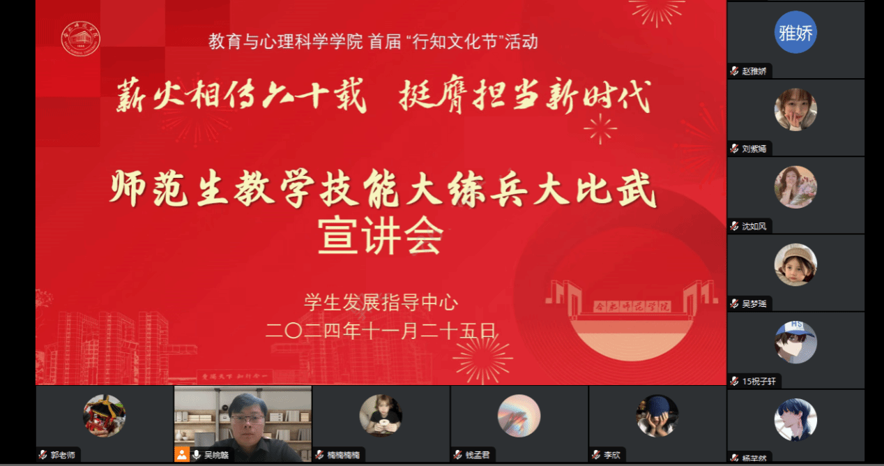为进一步强化师范生教育教学技能,提升学生的综合竞争力和职业发展力,11月25日晚,yl23411永利集团召开师范生教学技能大练兵大比武活动线上宣讲会。会议由yl23411永利集团学生发展指导中心主任吴皖赣主持,郭辰、晋玉等老师以及2021、2022级近百位学生参加宣讲会,2023、2024级学生同步在班级教室集体观摩。