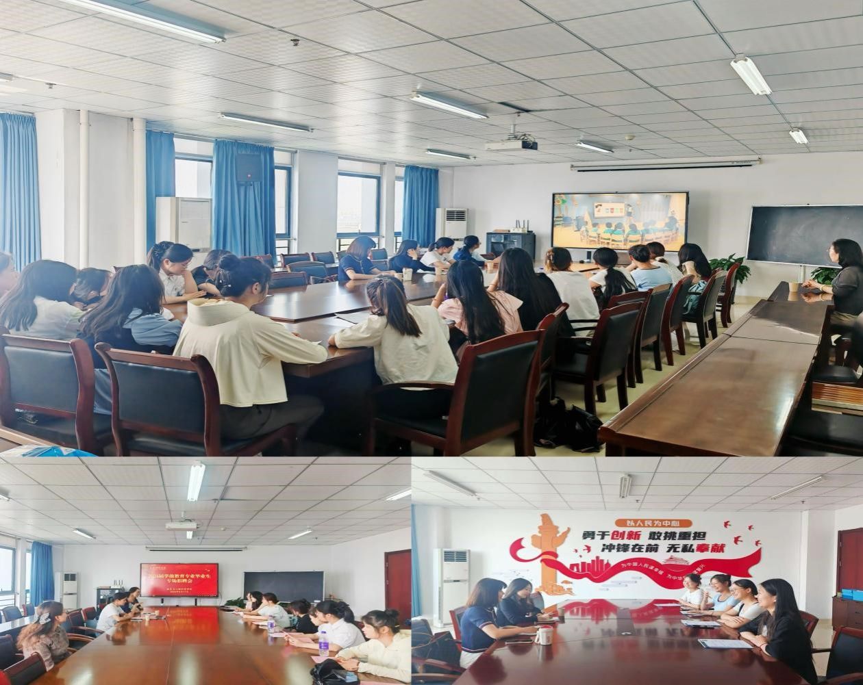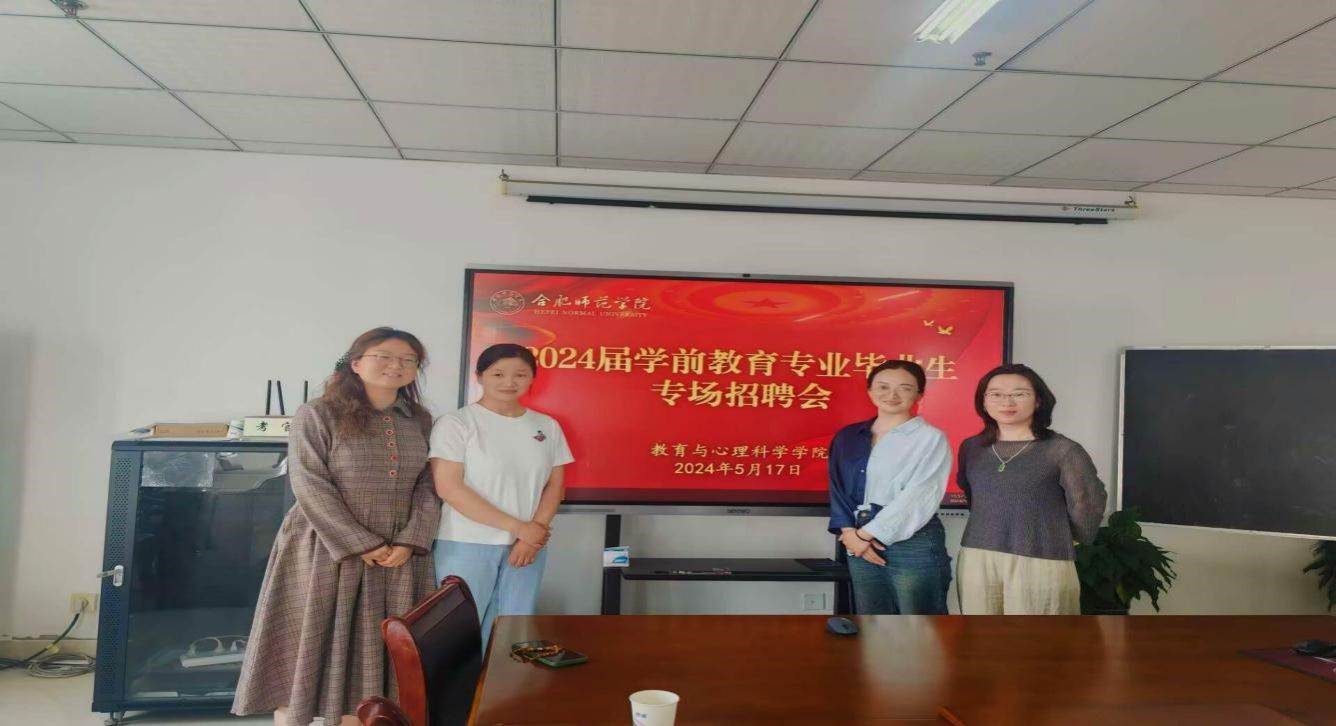 为深入学习贯彻党的二十大精神,认真落实“稳就业”“保就业”决策部署,进一步推进毕业生充分高质量就业,5月17日下午,yl23411永利集团在锦绣校区行知楼710会议室举办2024届学前教育专业学生专场招聘会,学前教育系主任孙延永、2024届毕业班辅导员唐淼、合肥市哈尔滨路幼儿园园长华琳琳、合肥市康园幼儿园老师姚晴晴两家单位参加招聘会,2024届学前教育专业全体毕业生参加了活动。