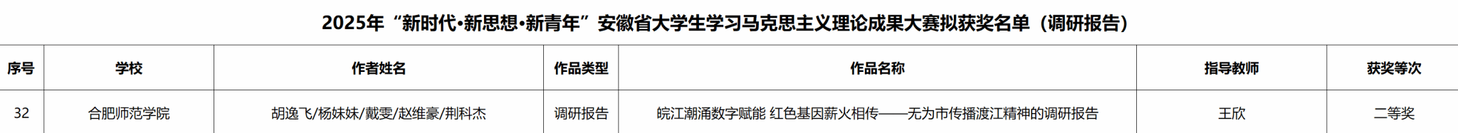 学院高度重视本届比赛,充分发挥心理学专业优势,积极组织、精准备赛,对参赛作品进行多轮打磨与优化,有力保障了参赛作品的质量。获奖作品中,2023级应用心理学专业学生胡逸飞同学带领团队完成的调研报告《皖江潮涌数字赋能 红色基因薪火相传——无为市传播渡江精神的调研报告》,聚焦无为市渡江精神传播的现实场景,通过实地走访、问卷调研等方式,系统分析数字技术在红色基因传承中的应用场景、实施路径与实践成效,为县域红色文化传承创新提供参考。凭借扎实调研与创新视角,荣获调研报告类二等奖;2023级应用心理学专业学生吕梓玥带领团队撰写的《马克思主义实践观视域下大学生“精神内耗”的现状及消解策略研究》,聚焦现实热点,运用专业理论深入剖析当代大学生面临的心理困境,荣获研究论文类三等奖。