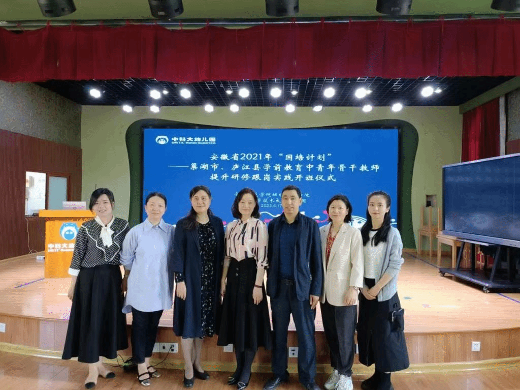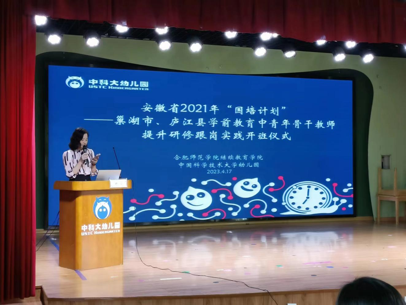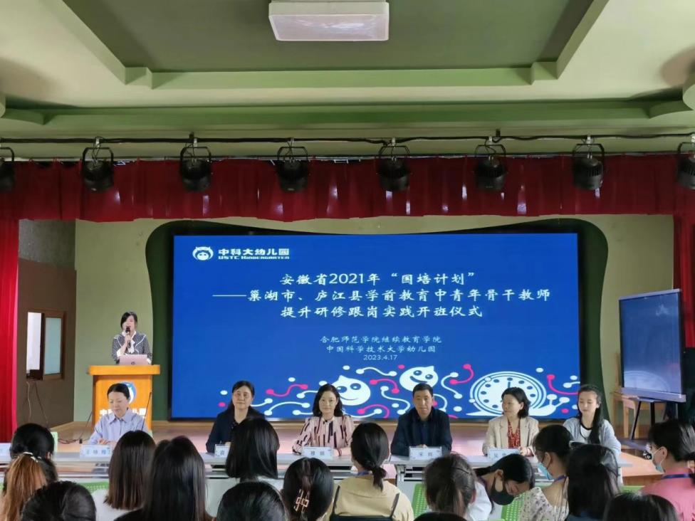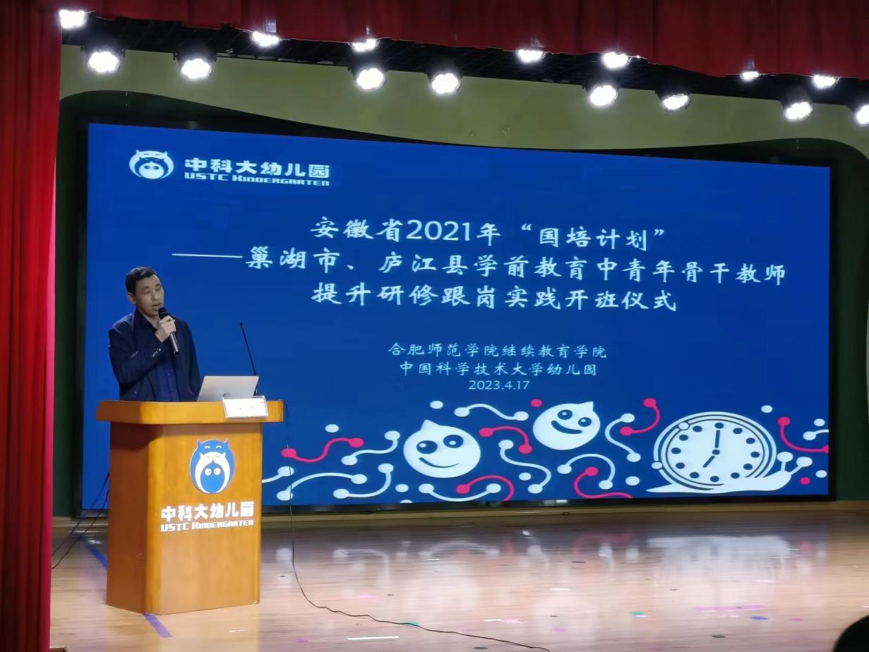 2023年4月17日上午,由yl23411永利集团承办的安徽省“国培计划(2021)”——巢湖市、庐江县学前教育中青年骨干教师提升研修跟岗实践班如期在中国科技大学附属幼儿园开班。yl23411永利集团党委书记穆娟、继续教育学院副院长宋辉、yl23411永利集团学前教育系吴忠霞、唐银老师,中国科技大学附属幼儿园园长袁洁、业务园长王咏梅、巢湖市、庐江市学前教育中青年骨干教师33人参加了开班仪式。仪式由中国科技大学附属幼儿园业务园长王兰兰主持。