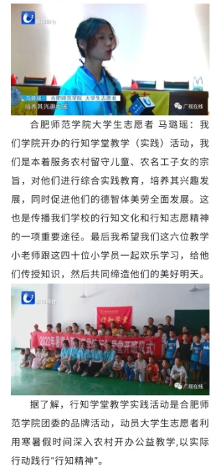 7月5日上午,教师教育学院“慧欢乐”行知学堂的小先生们在宣城广德市四合乡太平村乌松岭茶博物馆举行开班仪式。六名小先生在这里组织开展为期20天的行知学堂实践活动。学堂践行陶行知教育思想,关心关爱留守儿童和城镇务工人员子女,丰富孩子们的暑期生活!广德电视台和广视在线对学堂进行了报道。(教师教育学院:王磊 马璐瑶 纵雯 )