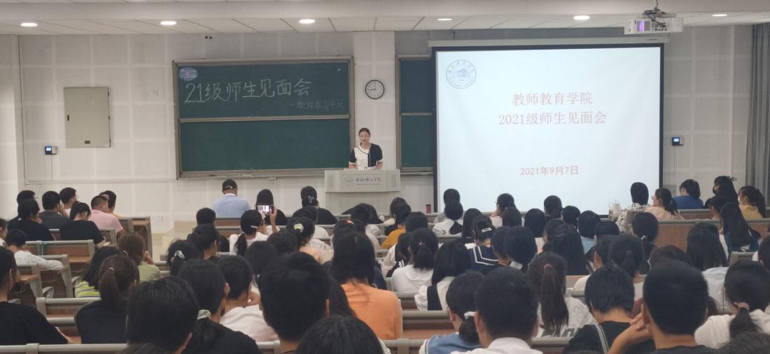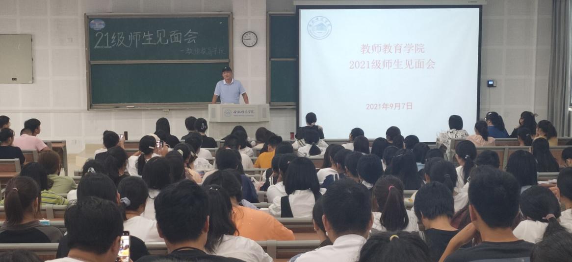 (本网讯)9月7日下午,教师教育学院在滨湖校区博学楼D101召开2021级新生师生见面会。教师教育学院党委书记穆娟、院长李群、副院长闫龙出席见面会,2021级全体新生参加会议,会议由新生辅导员董丹丹主持。