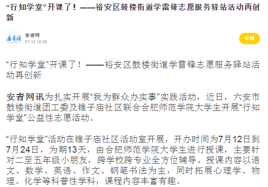 7月13日,六安交通音乐广播进行了报道。(教师教育学院:王磊)
