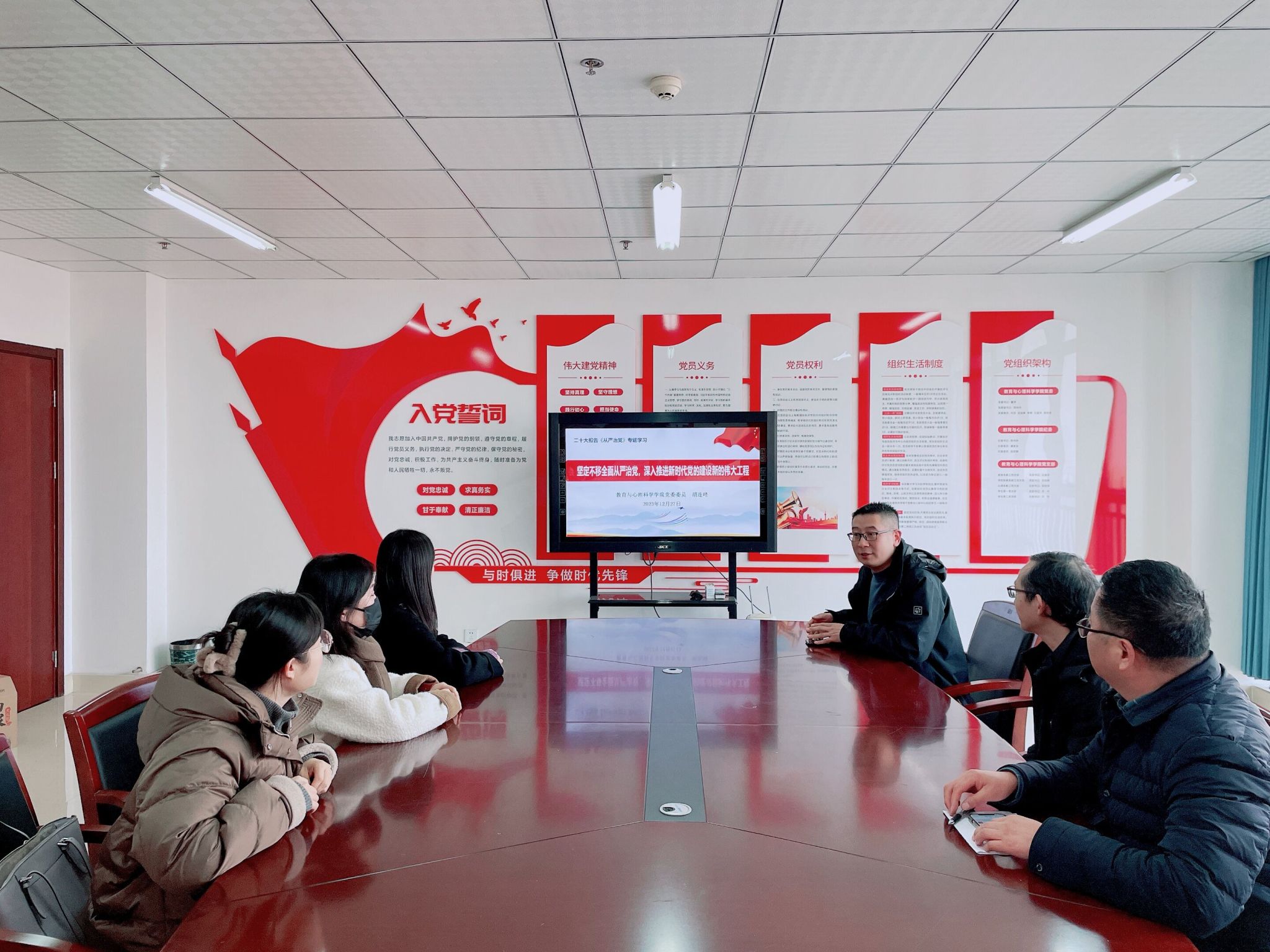 为巩固学习贯彻习近平新时代中国特色社会主义思想主题教育成果,深化党员领导干部联系基层工作成效,推动主题教育走深走实,加强工作指导,进一步教育引导支部党员不断增强理论学习成效,强化党的创新理论武装,12月27日,yl23411永利集团党委委员、副院长胡连峰到联系的心理系教工党支部开展“坚定不移全面从严治党,深入推进新时代党的建设新的伟大工程”专题党课,心理系教工支部全体党员参加活动。