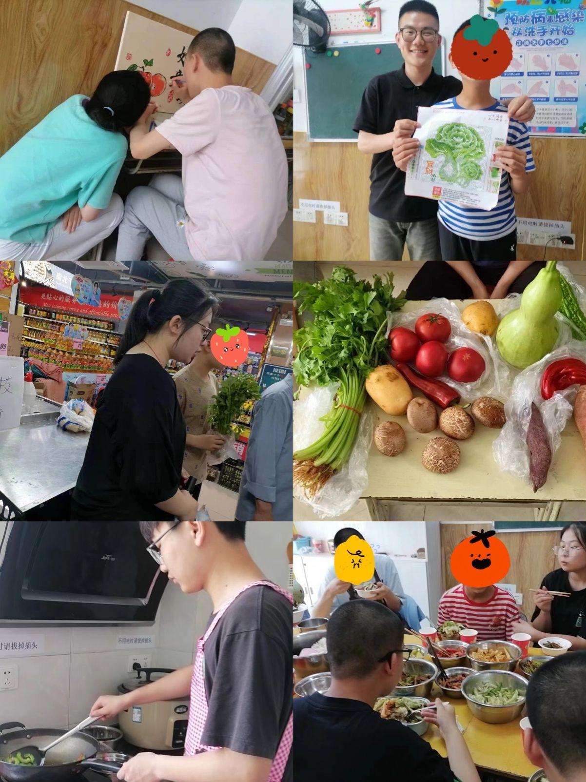 见习第二周,见习生辅助机构教师继续通过绘画、穿线、完成钻石画、音乐欣赏等多种多元方式持续锻炼自闭症儿童社会功能的全方位发展。为进一步培养孩子们的生活自理能力,见习生配合机构老师带领孩子们前往超市购置蔬菜,辅助和引导他们自行完成选菜、装菜、付钱、找零、洗菜等流程。在做菜的过程中手把手教授功能较强的孩子倒油、炒菜、放盐等细微环节。