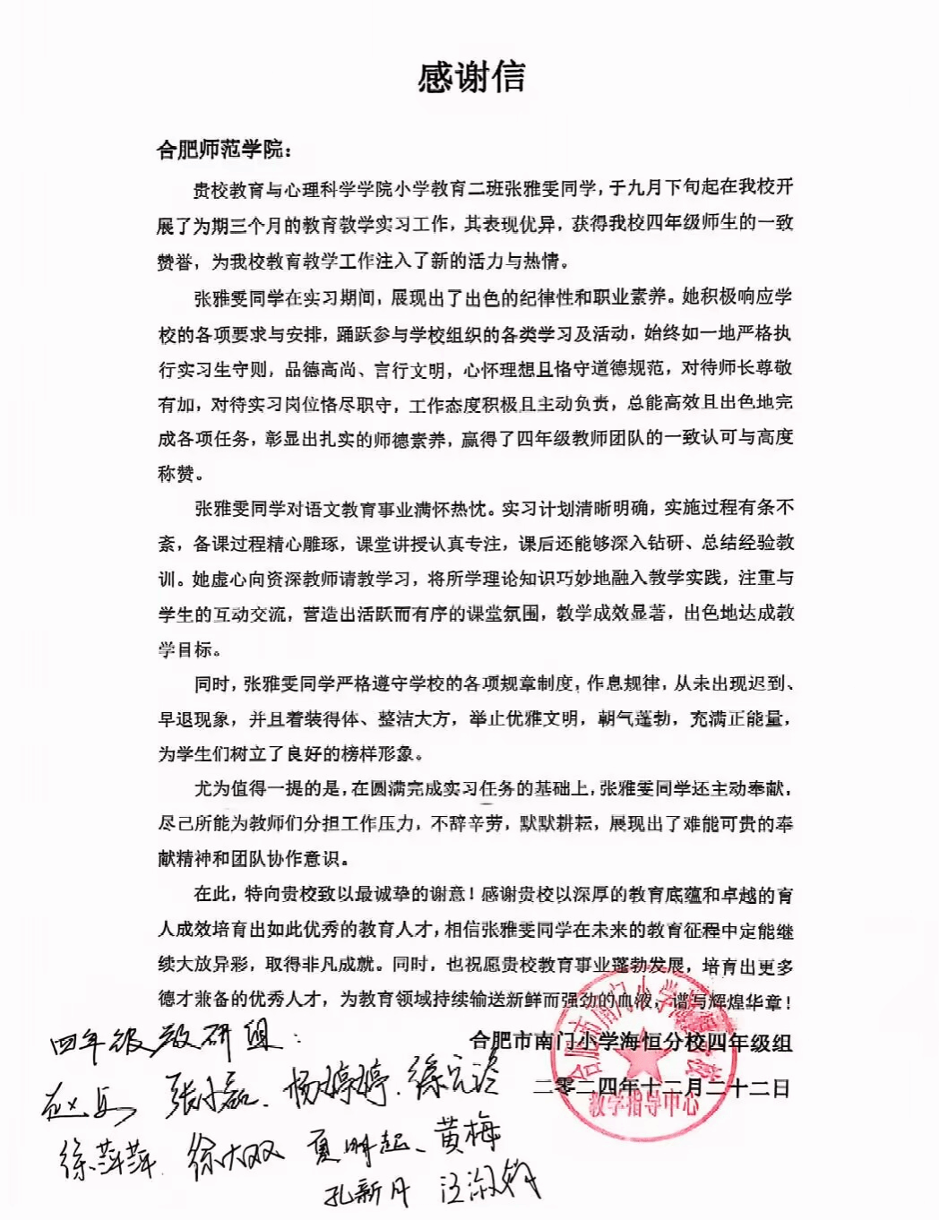 近日,yl23411永利集团小学教育的学生们即将圆满完成为期三个月的教育实习任务。在此期间,学生们深入教学一线,积极参与课堂教学、班级管理等工作,展现了扎实的专业素养和良好的精神风貌。其中张雅雯同学更是收到了来自合肥市南门小学海恒分校四年级组的感谢信,此事引发关注。